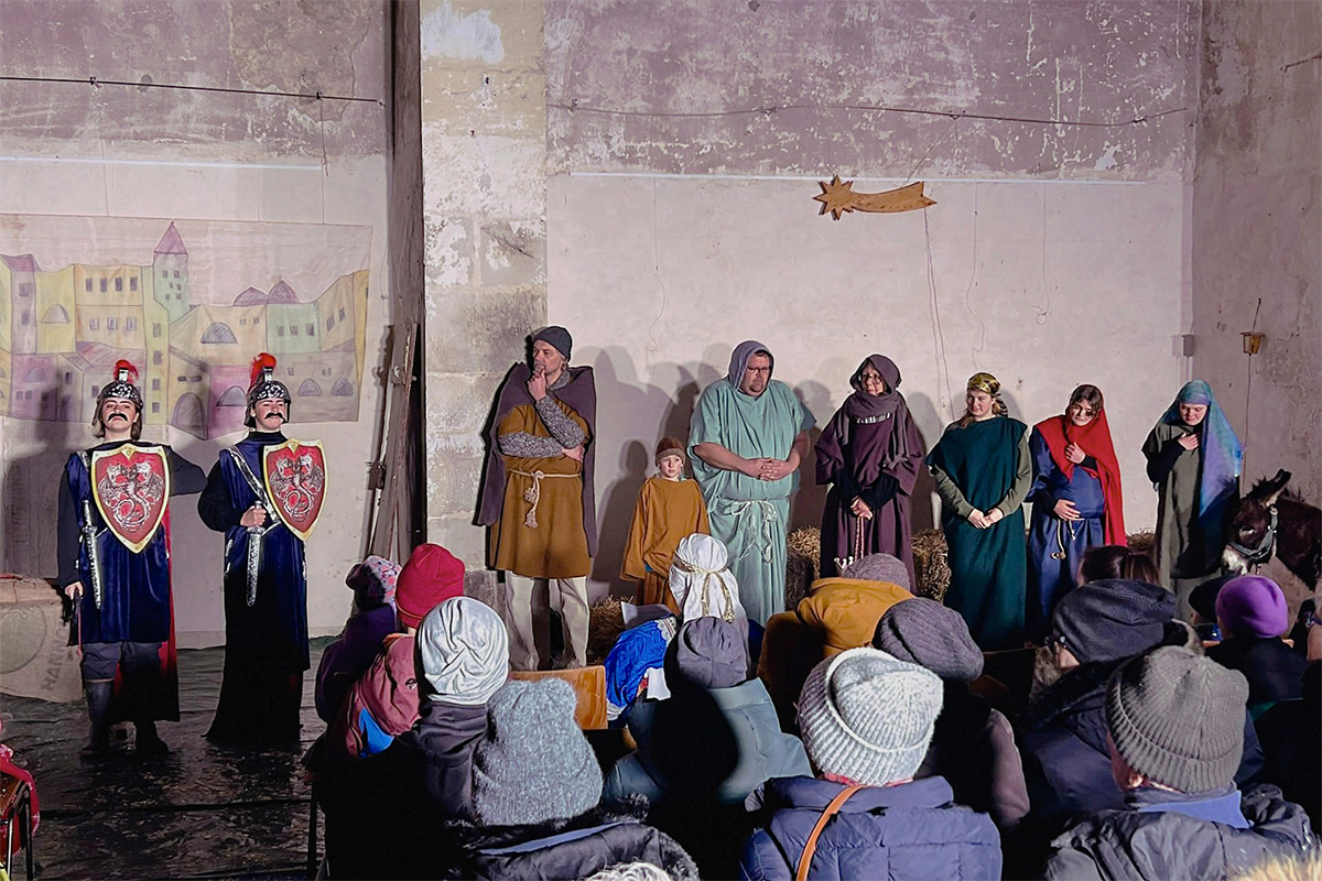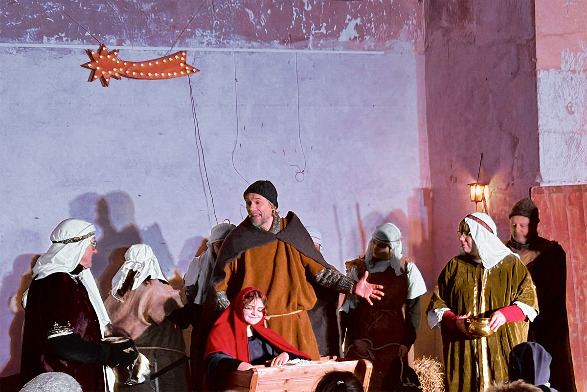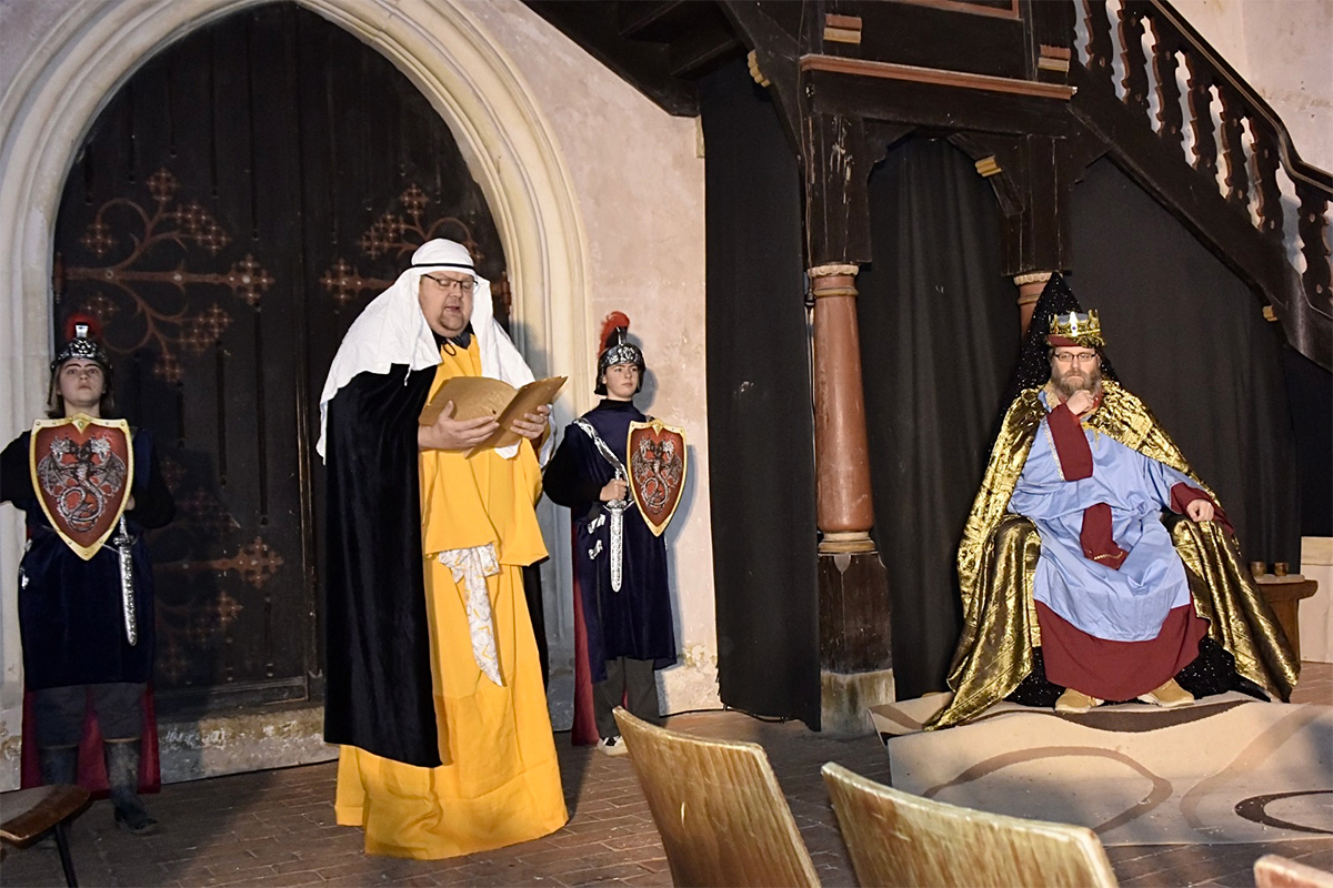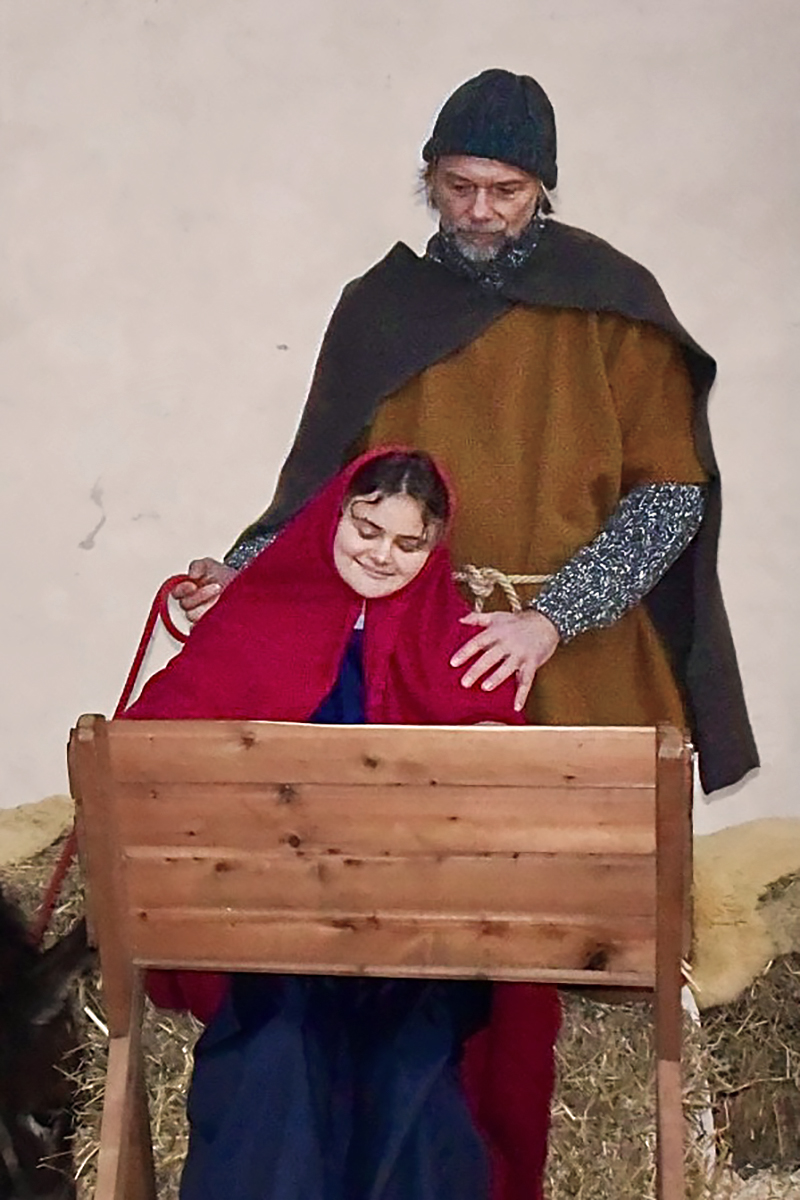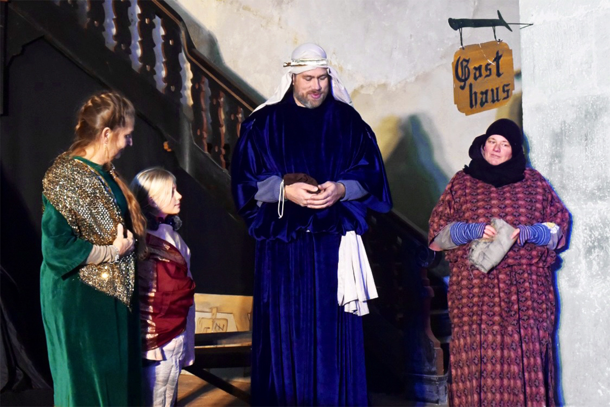 Josef (Martin Schiepanski), Maria (Joy-Leonie Nebe) mit ihrem Esel (Piko) erfuhren die harten Abweisungen der Wirtinnen und erlebten dann im Kontrast dazu die freundliche Einladung in einen Stall in Bethlehem. Ein starker König Herodes (Sven Heinzel) mit seinen zwei Hauptmännern (Arlina Flügel und Aliyah Böhlke), die heiligen drei Könige, die Hirten und die anderen Schauspieler überzeugten die Zuschauerinnen und Zuschauer mit Erfahrung und manchmal auch mit notwendigen Improvisationen.